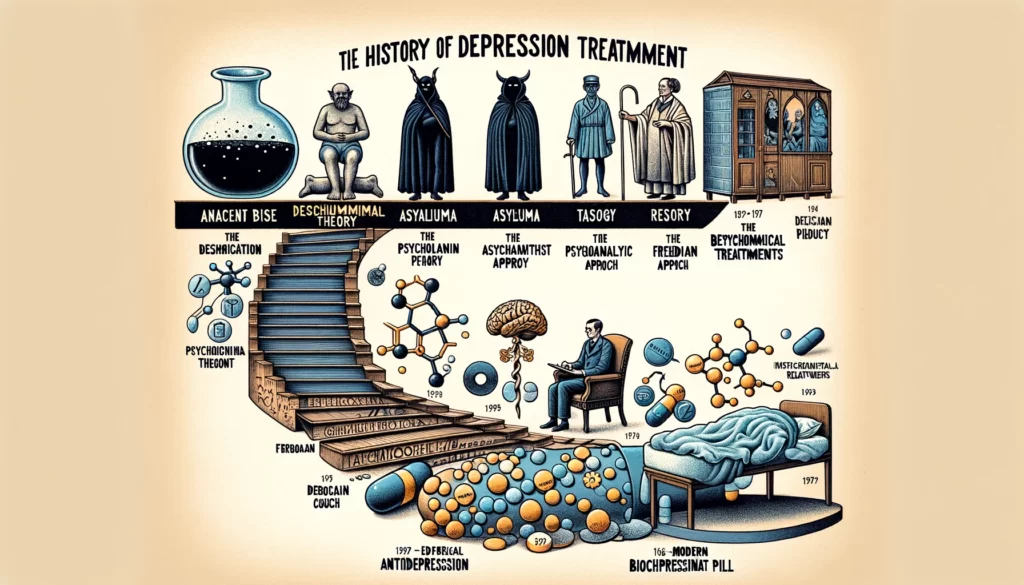 20. Yüzyılın Ortası ve Sonu : Antidepresan ilaçların keşfi depresyonun biyolojik temellerine ve tedavisine yeni bir bakış açısı getirdi. Trisiklikler, MAO inhibitörleri ve daha sonra SSRI’lar gibi antidepresanlar kullanıma girdi. Antidepresanların yaygın kullanımı, depresyon tedavisini dönüştürdü. Psikoterapi gelişmeye devam etti. Özellikle bilişsel-davranışçı terapi (BDT) önemli bir yaklaşım olarak ortaya çıktı.
